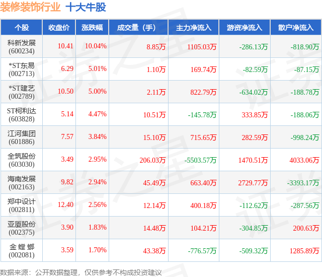 个股表现方面,装修装饰行业当日领涨股为科新发展(600234),该股当日报收10.41,上涨10.04%,成交量8.85万,主力资金净流入1105.03万元。*ST东易(002713)以上涨5.01%紧随其后,该股当日成交量1.1万,主力资金净流入169.74万元。除此之外,*ST建艺(002789)、ST柯利达(603828)、江河集团(601886)均进入当日牛股之列。具体个股列表见下表: