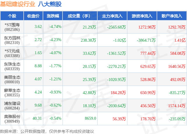 个股表现方面,基础建设行业当日领跌股为*ST围海(002586),该股当日报收3.62,下跌4.74%,成交量21.29万,主力资金净流出2565.68万元。东方园林(002310)以下跌4.23%紧随其后,该股当日成交量238.38万,主力资金净流出1.02亿元。除此之外,*ST元成(603388)、东珠生态(603359)、美丽生态(000010)均进入当日熊股之列。具体个股列表见下表: