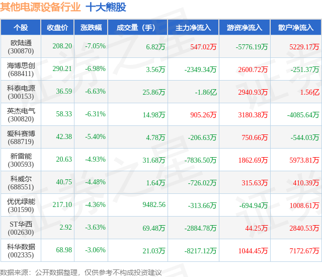 个股表现方面,其他电源设备行业当日领跌股为欧陆通(300870),该股当日报收208.2,下跌7.05%,成交量6.82万,主力资金净流入547.02万元。海博思创(688411)以下跌6.98%紧随其后,该股当日成交量3.56万,主力资金净流出2349.34万元。除此之外,科泰电源(300153)、英杰电气(300820)、爱科赛博(688719)均进入当日熊股之列。具体个股列表见下表: