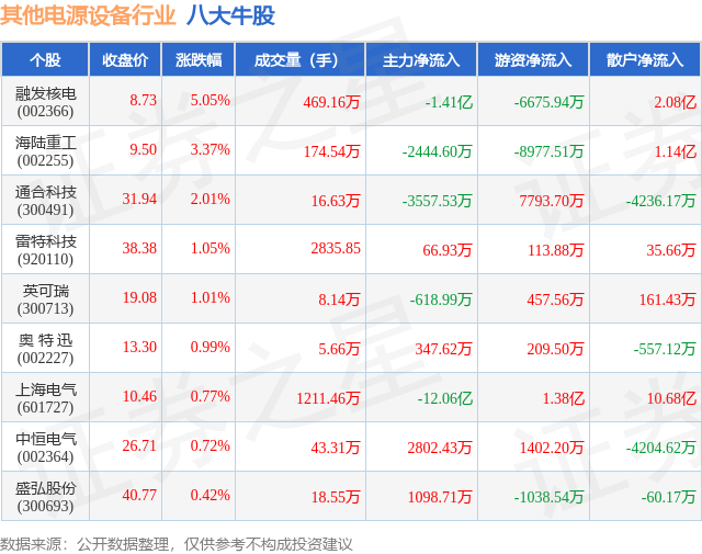 个股表现方面,其他电源设备行业当日领涨股为融发核电(002366),该股当日报收8.73,上涨5.05%,成交量469.16万,主力资金净流出1.41亿元。海陆重工(002255)以上涨3.37%紧随其后,该股当日成交量174.54万,主力资金净流出2444.6万元。除此之外,通合科技(300491)、雷特科技(920110)、英可瑞(300713)均进入当日牛股之列。具体个股列表见下表:
