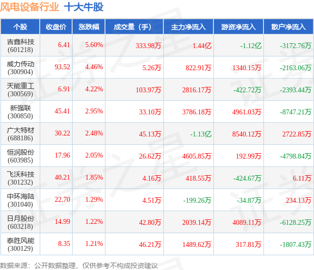 个股表现方面,风电设备行业当日领涨股为吉鑫科技(601218),该股当日报收6.41,上涨5.6%,成交量333.98万,主力资金净流入1.44亿元。威力传动(300904)以上涨4.46%紧随其后,该股当日成交量5.26万,主力资金净流入822.91万元。除此之外,天能重工(300569)、新强联(300850)、广大特材(688186)均进入当日牛股之列。具体个股列表见下表: