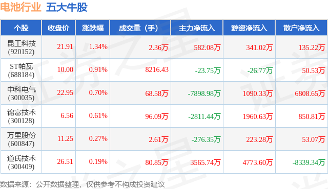 个股表现方面,电池行业当日领涨股为昆工科技(920152),该股当日报收21.91,上涨1.34%,成交量2.36万,主力资金净流入582.08万元。ST帕瓦(688184)以上涨0.91%紧随其后,该股当日成交量8216.0,主力资金净流出23.75万元。除此之外,中科电气(300035)、锦富技术(300128)、万里股份(600847)均进入当日牛股之列。具体个股列表见下表: