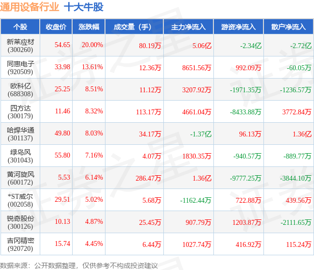 个股表现方面,通用设备行业当日领涨股为新莱应材(300260),该股当日报收54.65,上涨20.0%,成交量80.19万,主力资金净流入5.06亿元。同惠电子(920509)以上涨13.61%紧随其后,该股当日成交量12.36万,主力资金净流入8651.56万元。除此之外,欧科亿(688308)、四方达(300179)、哈焊华通(301137)均进入当日牛股之列。具体个股列表见下表: