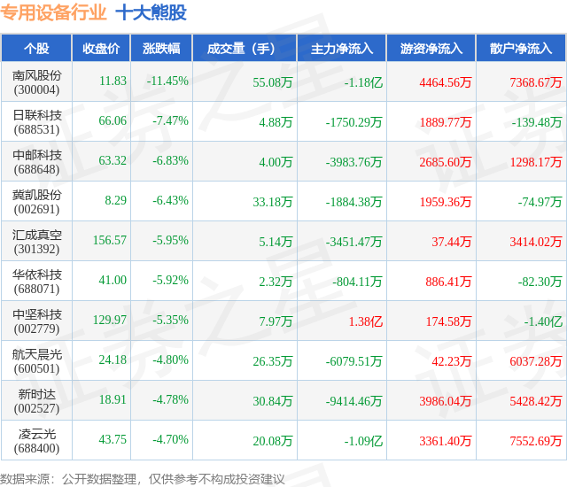 个股表现方面,专用设备行业当日领跌股为南风股份(300004),该股当日报收11.83,下跌11.45%,成交量55.08万,主力资金净流出1.18亿元。日联科技(688531)以下跌7.47%紧随其后,该股当日成交量4.88万,主力资金净流出1750.29万元。除此之外,中邮科技(688648)、冀凯股份(002691)、汇成真空(301392)均进入当日熊股之列。具体个股列表见下表: