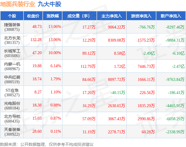 个股表现方面,地面兵装行业当日领涨股为捷强装备(300875),该股当日报收48.73,上涨13.06%,成交量17.27万,主力资金净流入9064.22万元。北方长龙(301357)以上涨13.06%紧随其后,该股当日成交量12.29万,主力资金净流入8309.08万元。除此之外,长城军工(601606)、内蒙一机(600967)、中兵红箭(000519)均进入当日牛股之列。具体个股列表见下表: