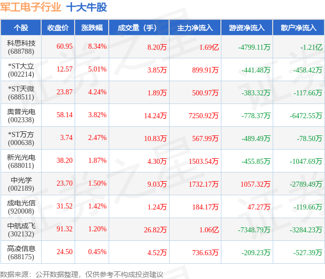 个股表现方面,军工电子行业当日领涨股为科思科技(688788),该股当日报收60.95,上涨8.34%,成交量8.2万,主力资金净流入1.69亿元。*ST大立(002214)以上涨5.01%紧随其后,该股当日成交量3.85万,主力资金净流入899.91万元。除此之外,*ST天微(688511)、奥普光电(002338)、*ST万方(000638)均进入当日牛股之列。具体个股列表见下表: