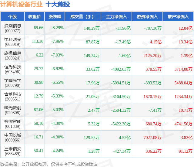 个股表现方面,计算机设备行业当日领跌股为浪潮信息(000977),该股当日报收69.66,下跌8.29%,成交量140.29万,主力资金净流出11.96亿元。中科曙光(603019)以下跌7.96%紧随其后,该股当日成交量87.87万,主力资金净流出17.49亿元。除此之外,旋极信息(300324)、恒为科技(603496)、宇瞳光学(300790)均进入当日熊股之列。具体个股列表见下表: