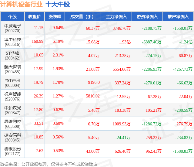 个股表现方面,计算机设备行业当日领涨股为中威电子(300270),该股当日报收11.15,上涨9.64%,成交量60.37万,主力资金净流入3746.76万元。淳中科技(603516)以上涨6.19%紧随其后,该股当日成交量15.68万,主力资金净流入1.93亿元。除此之外,ST华铭(300462)、航天智装(300455)、*ST声迅(003004)均进入当日牛股之列。具体个股列表见下表: