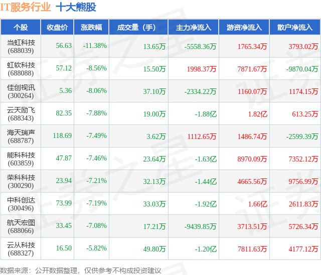 个股表现方面,IT服务行业当日领跌股为当虹科技(688039),该股当日报收56.63,下跌11.38%,成交量13.65万,主力资金净流出5558.36万元。虹软科技(688088)以下跌8.56%紧随其后,该股当日成交量15.5万,主力资金净流入1998.37万元。除此之外,佳创视讯(300264)、云天励飞(688343)、海天瑞声(688787)均进入当日熊股之列。具体个股列表见下表: