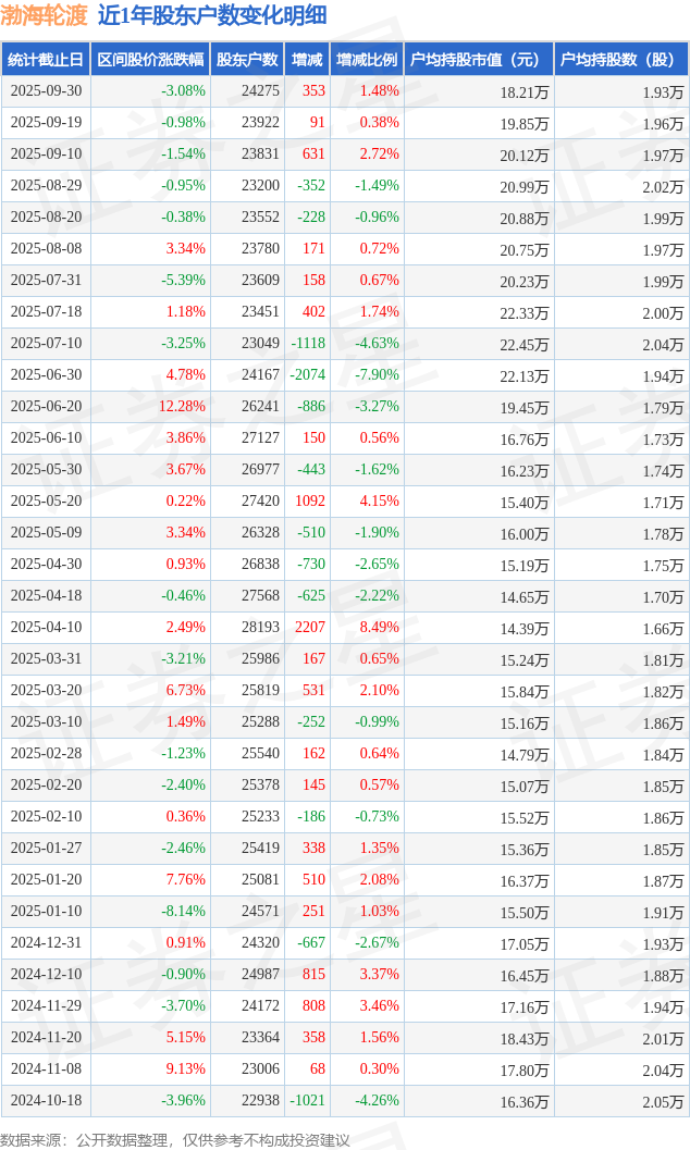 从股价来看,2025年9月19日至2025年9月30日,渤海轮渡区间跌幅为3.08%,在此期间股东户数增加353.0户,增幅为1.48%。