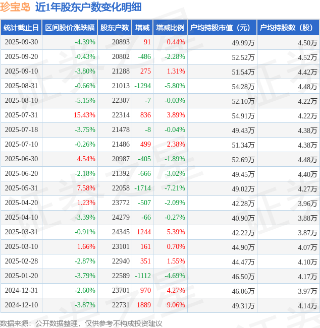 从股价来看,2025年9月20日至2025年9月30日,珍宝岛区间跌幅为4.39%,在此期间股东户数增加91.0户,增幅为0.44%。