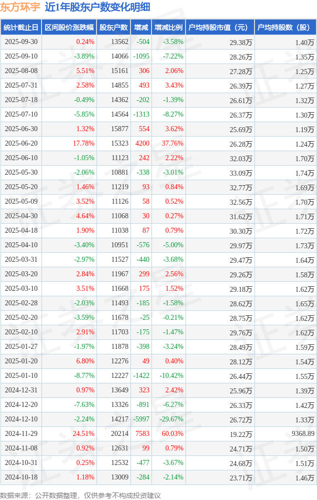 从股价来看,2025年9月10日至2025年9月30日,东方环宇区间涨幅为0.24%,在此期间股东户数减少504.0户,减幅为3.58%。