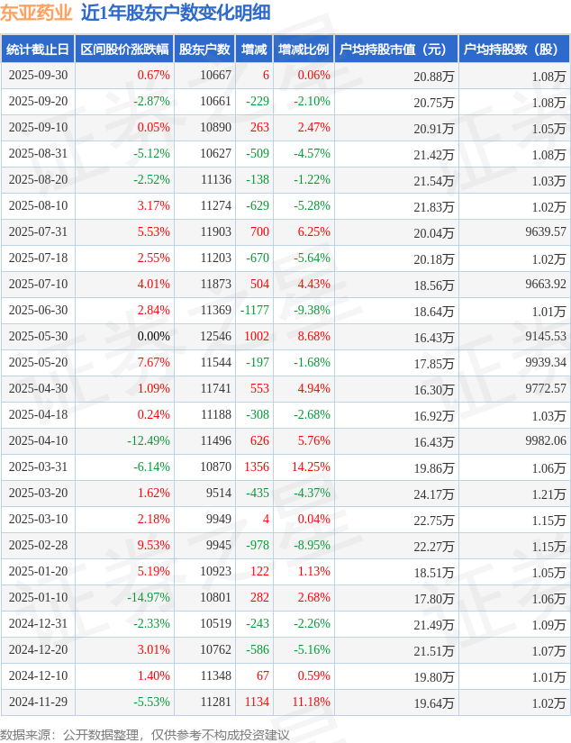 从股价来看,2025年9月20日至2025年9月30日,东亚药业区间涨幅为0.67%,在此期间股东户数增加6.0户,增幅为0.06%。