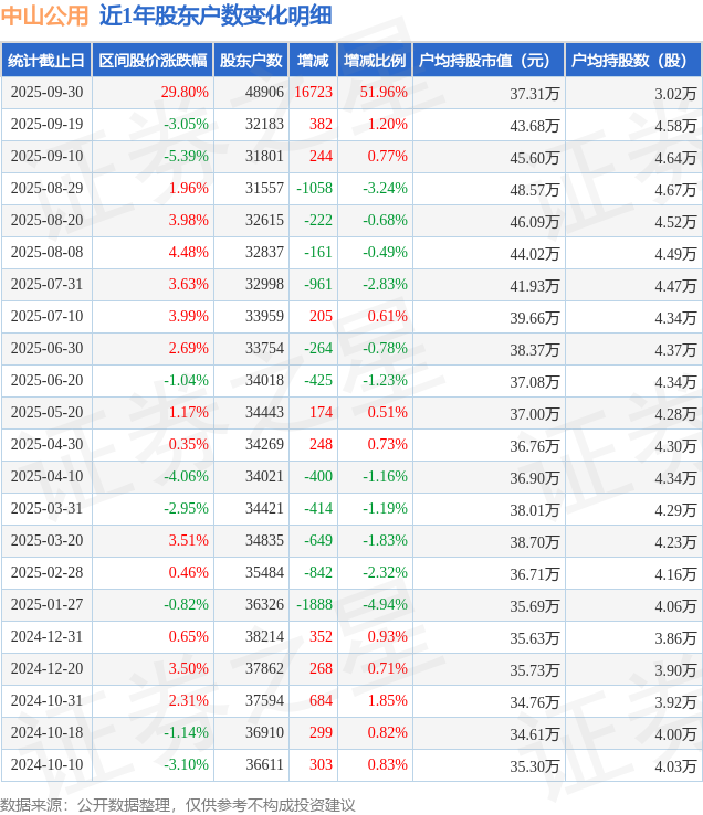 从股价来看,2025年9月19日至2025年9月30日,中山公用区间涨幅为29.8%,在此期间股东户数增加1.67万户,增幅为51.96%。