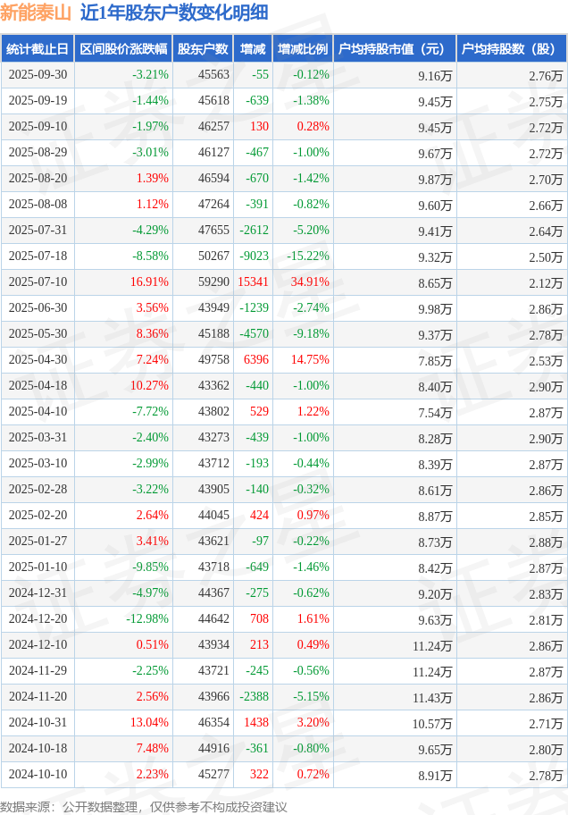 从股价来看,2025年9月19日至2025年9月30日,新能泰山区间跌幅为3.21%,在此期间股东户数减少55.0户,减幅为0.12%。