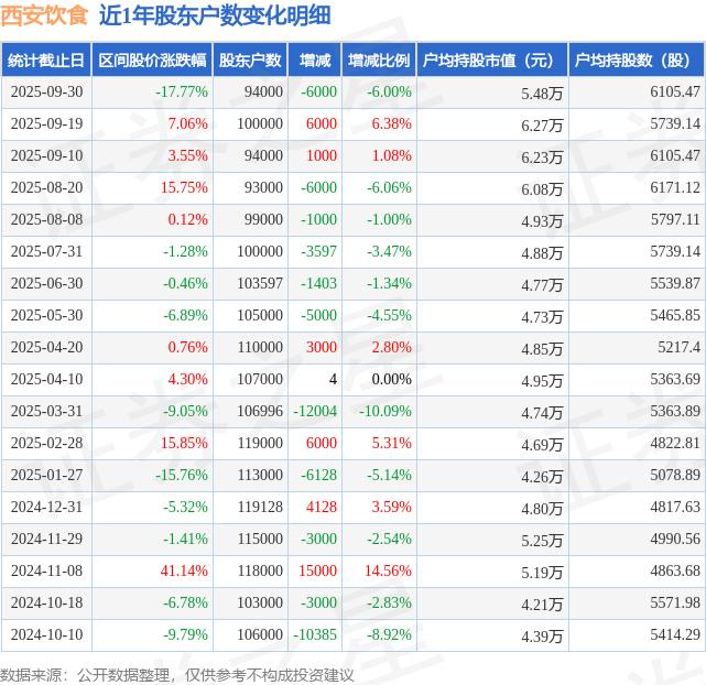 从股价来看,2025年9月19日至2025年9月30日,西安饮食区间跌幅为17.77%,在此期间股东户数减少6000.0户,减幅为6.0%。