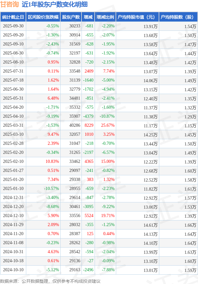 从股价来看,2025年9月20日至2025年9月30日,甘咨询区间跌幅为0.55%,在此期间股东户数减少681.0户,减幅为2.2%。