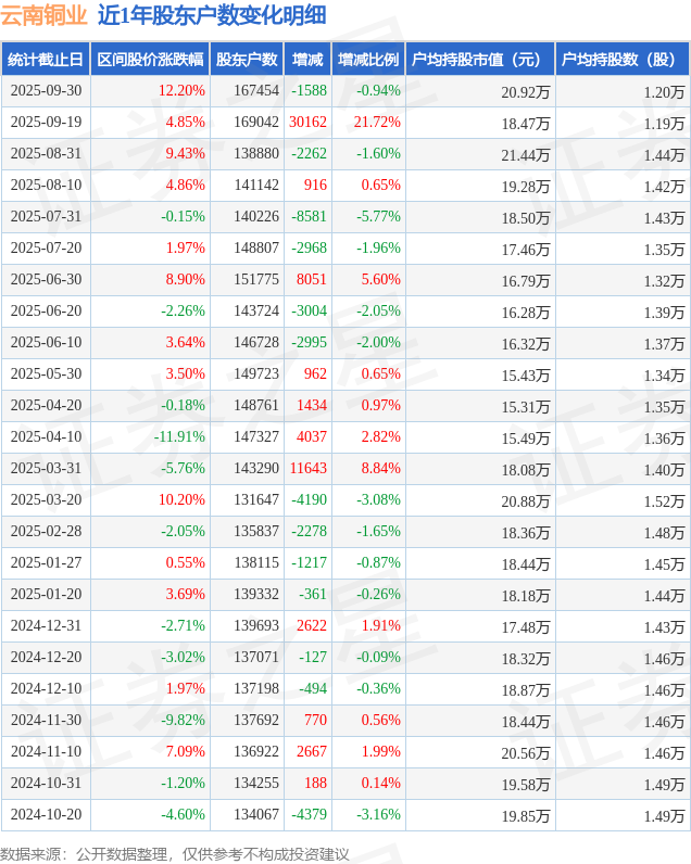 从股价来看,2025年9月19日至2025年9月30日,云南铜业区间涨幅为12.2%,在此期间股东户数减少1588.0户,减幅为0.94%。