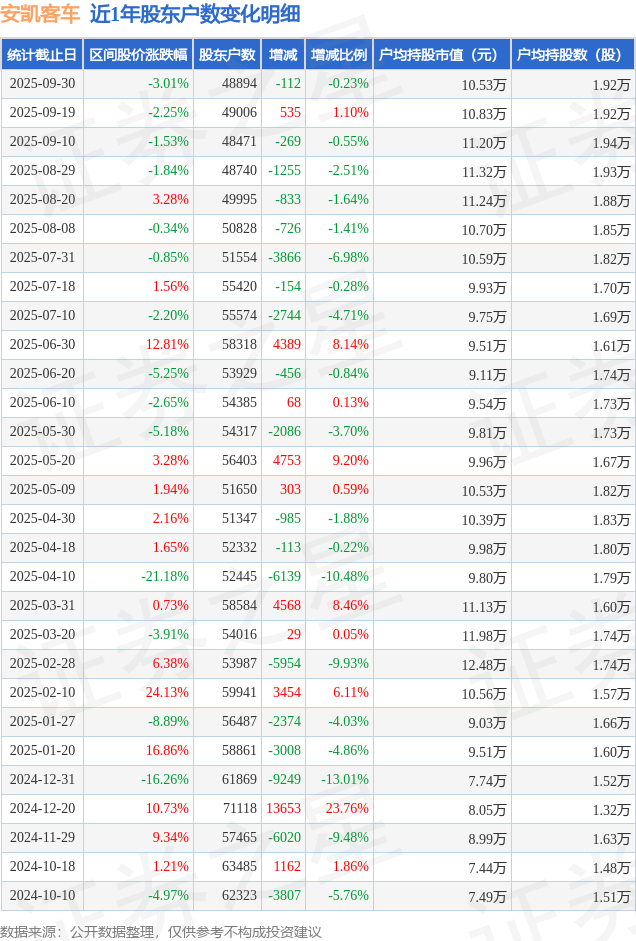 从股价来看,2025年9月19日至2025年9月30日,安凯客车区间跌幅为3.01%,在此期间股东户数减少112.0户,减幅为0.23%。