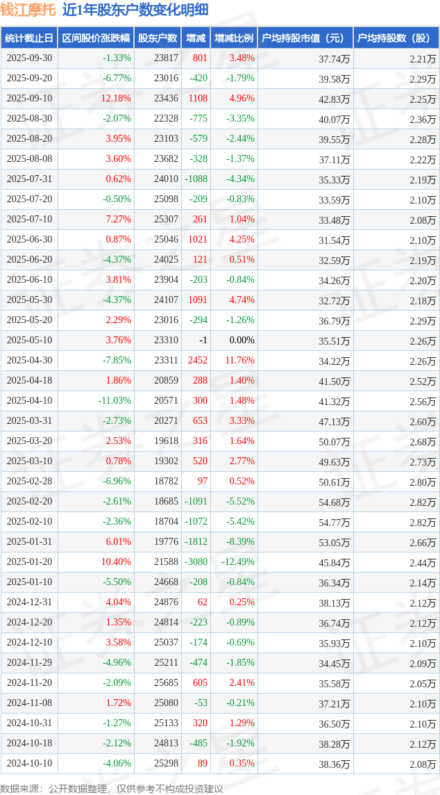 从股价来看,2025年9月20日至2025年9月30日,钱江摩托区间跌幅为1.33%,在此期间股东户数增加801.0户,增幅为3.48%。
