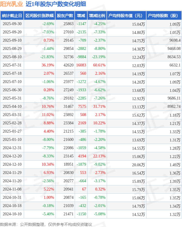 从股价来看,2025年9月20日至2025年9月30日,阳光乳业区间跌幅为2.69%,在此期间股东户数减少1147.0户,减幅为4.25%。
