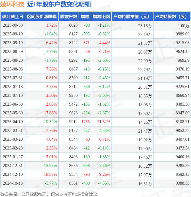 从股价来看,2025年9月19日至2025年9月30日,楚环科技区间涨幅为1.72%,在此期间股东户数减少98.0户,减幅为1.21%。