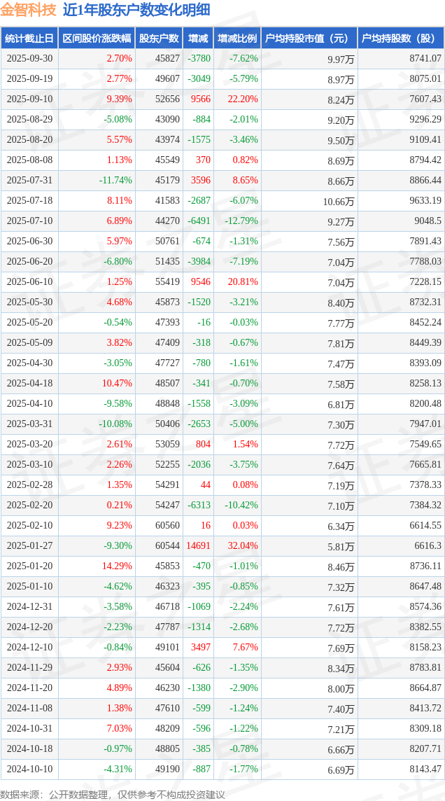 从股价来看,2025年9月19日至2025年9月30日,金智科技区间涨幅为2.7%,在此期间股东户数减少3780.0户,减幅为7.62%。