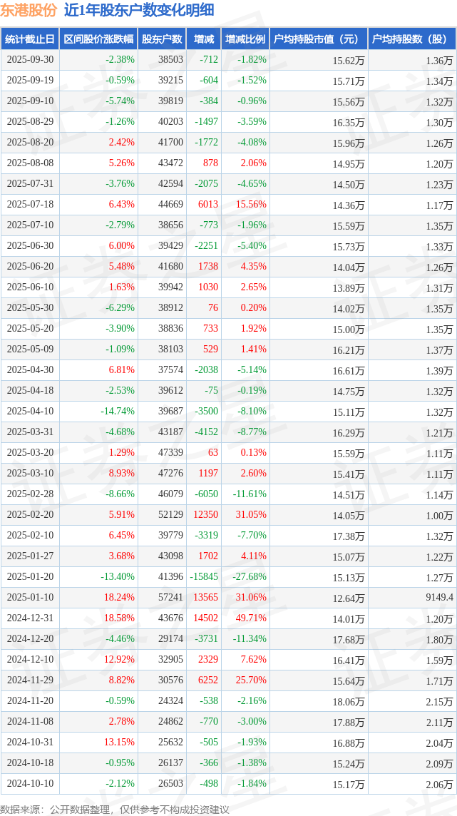 从股价来看,2025年9月19日至2025年9月30日,东港股份区间跌幅为2.38%,在此期间股东户数减少712.0户,减幅为1.82%。