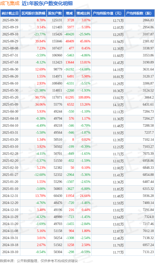 从股价来看,2025年9月19日至2025年9月30日,成飞集成区间涨幅为8.7%,在此期间股东户数增加3728.0户,增幅为3.07%。