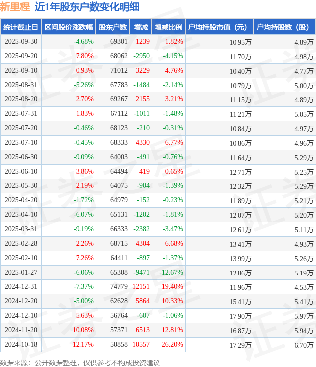 从股价来看,2025年9月20日至2025年9月30日,新里程区间跌幅为4.68%,在此期间股东户数增加1239.0户,增幅为1.82%。