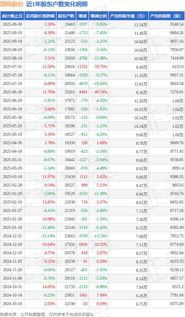 从股价来看,2025年9月19日至2025年9月30日,国统股份区间涨幅为5.59%,在此期间股东户数减少1937.0户,减幅为9.05%。