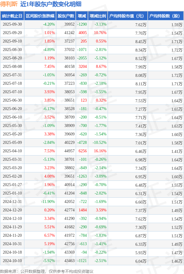 从股价来看,2025年9月20日至2025年9月30日,得利斯区间跌幅为4.2%,在此期间股东户数减少1290.0户,减幅为3.13%。
