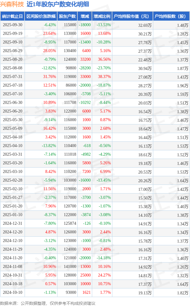 从股价来看,2025年9月19日至2025年9月30日,兴森科技区间跌幅为6.43%,在此期间股东户数减少1.8万户,减幅为13.53%。