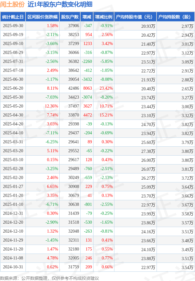 从股价来看,2025年9月19日至2025年9月30日,闰土股份区间涨幅为1.58%,在此期间股东户数减少347.0户,减幅为0.91%。