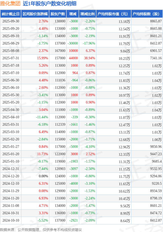 从股价来看,2025年9月20日至2025年9月30日,雅化集团区间涨幅为2.76%,在此期间股东户数减少3000.0户,减幅为2.26%。