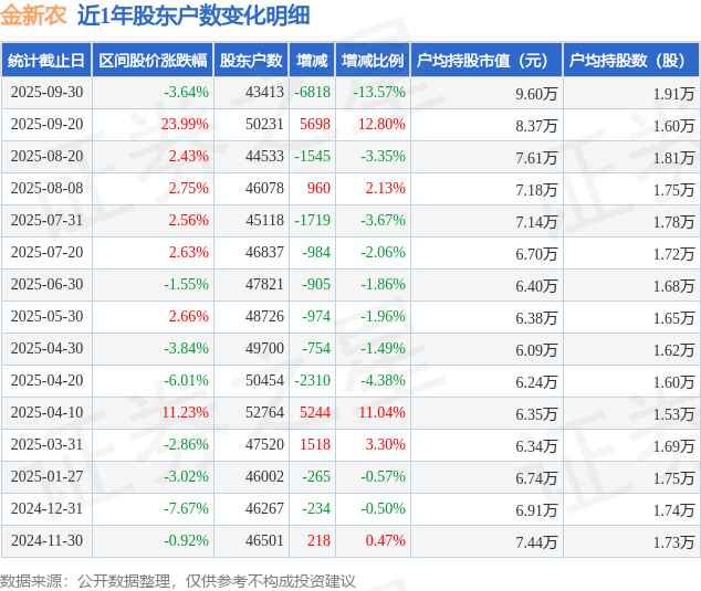 从股价来看,2025年9月20日至2025年9月30日,金新农区间跌幅为3.64%,在此期间股东户数减少6818.0户,减幅为13.57%。