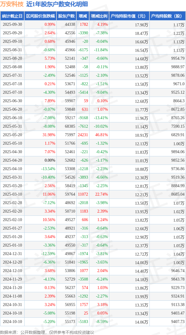 从股价来看,2025年9月20日至2025年9月30日,万安科技区间涨幅为0.99%,在此期间股东户数增加1782.0户,增幅为4.19%。