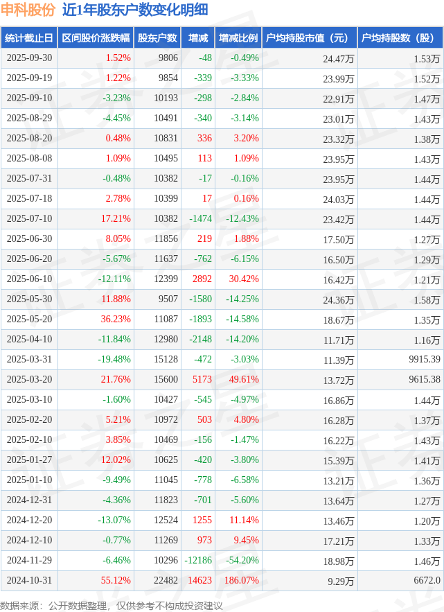 从股价来看,2025年9月19日至2025年9月30日,申科股份区间涨幅为1.52%,在此期间股东户数减少48.0户,减幅为0.49%。