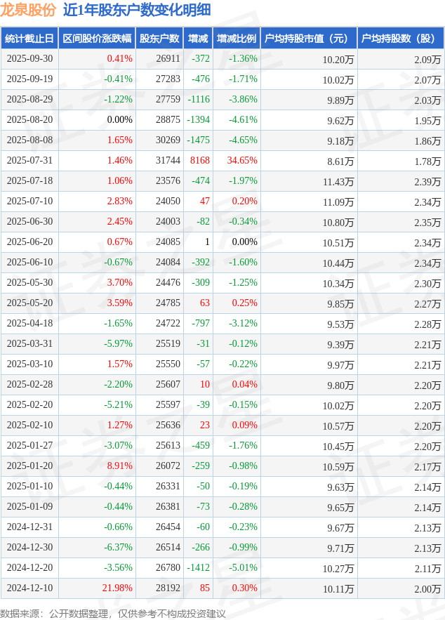 从股价来看,2025年8月29日至2025年9月30日,龙泉股份区间跌幅为0.0%,在此期间股东户数减少848.0户,减幅为3.05%。