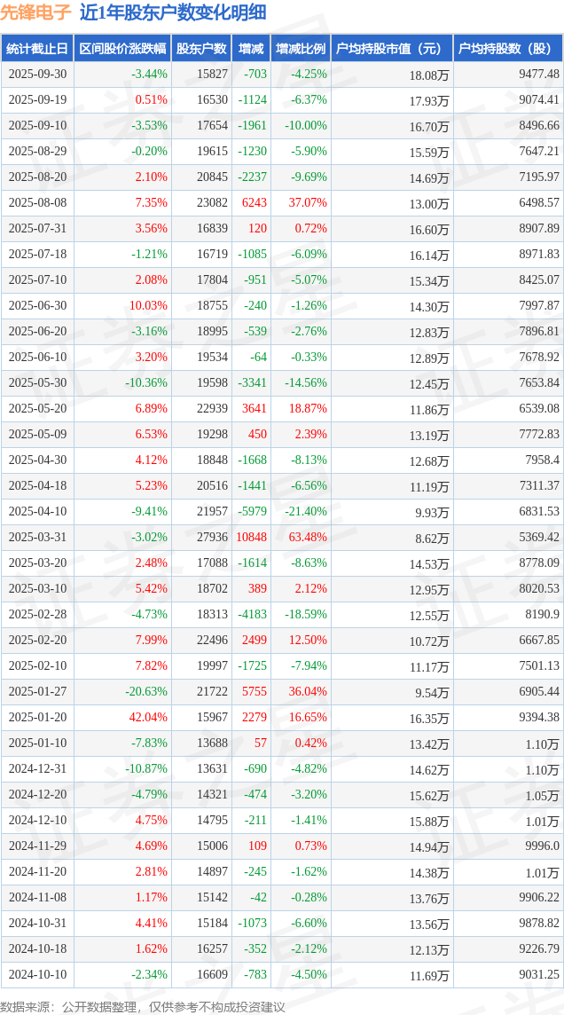 从股价来看,2025年9月19日至2025年9月30日,先锋电子区间跌幅为3.44%,在此期间股东户数减少703.0户,减幅为4.25%。