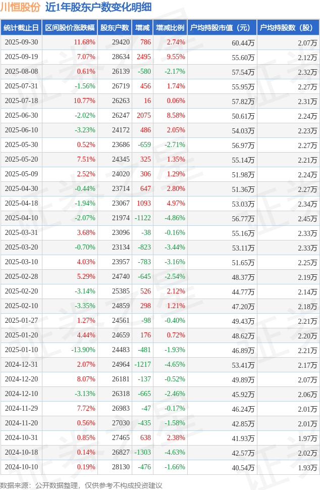 从股价来看,2025年9月19日至2025年9月30日,川恒股份区间涨幅为11.68%,在此期间股东户数增加786.0户,增幅为2.74%。