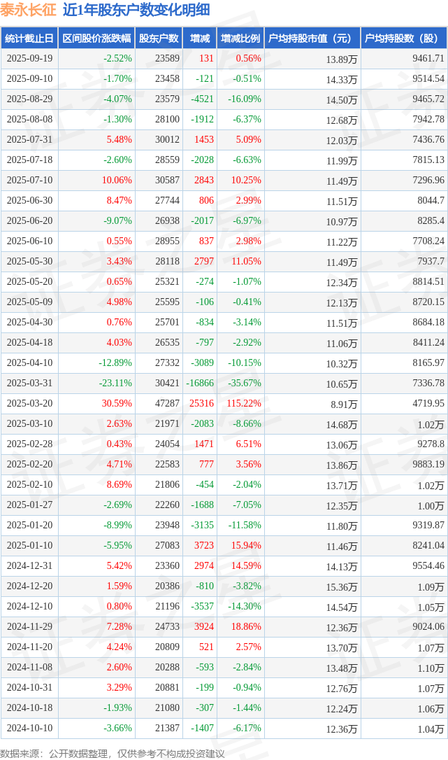 从股价来看,2025年9月10日至2025年9月19日,泰永长征区间跌幅为2.52%,在此期间股东户数增加131.0户,增幅为0.56%。