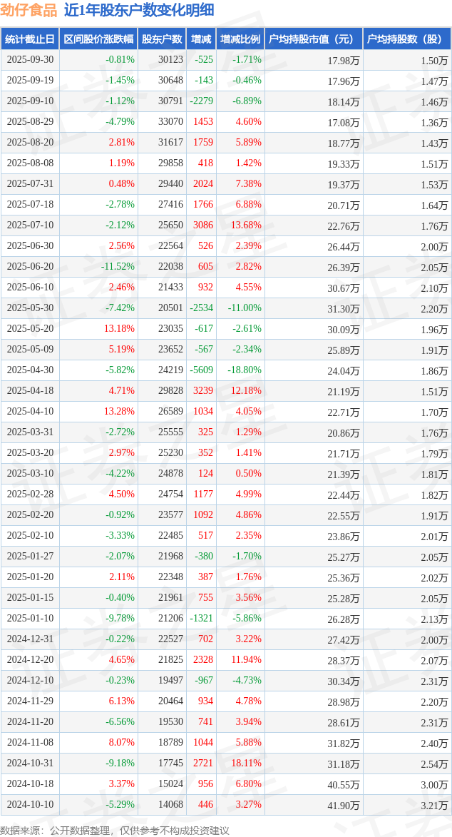 从股价来看,2025年9月19日至2025年9月30日,劲仔食品区间跌幅为0.81%,在此期间股东户数减少525.0户,减幅为1.71%。