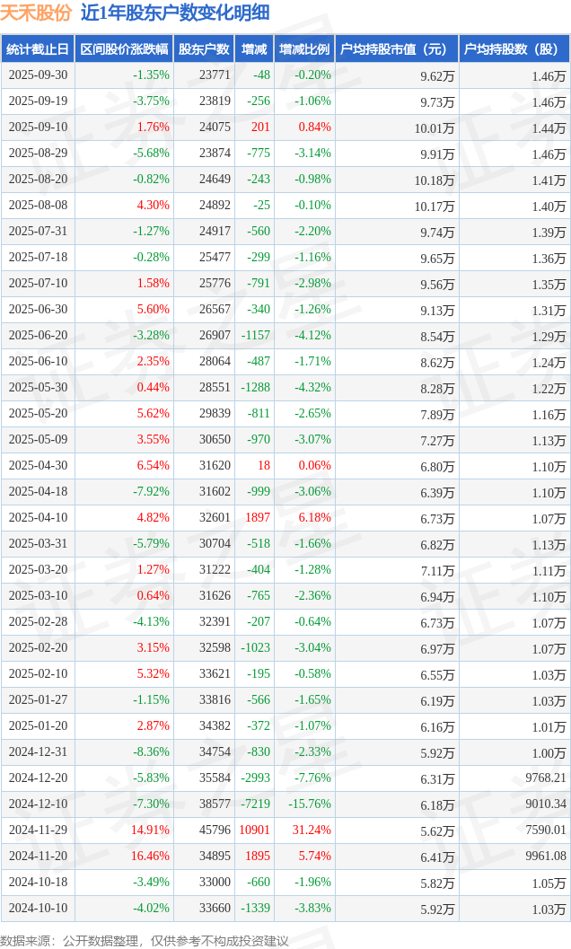 从股价来看,2025年9月19日至2025年9月30日,天禾股份区间跌幅为1.35%,在此期间股东户数减少48.0户,减幅为0.2%。