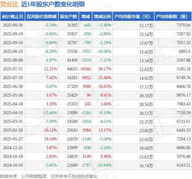 从股价来看,2025年9月19日至2025年9月30日,竞业达区间跌幅为3.74%,在此期间股东户数减少445.0户,减幅为1.4%。