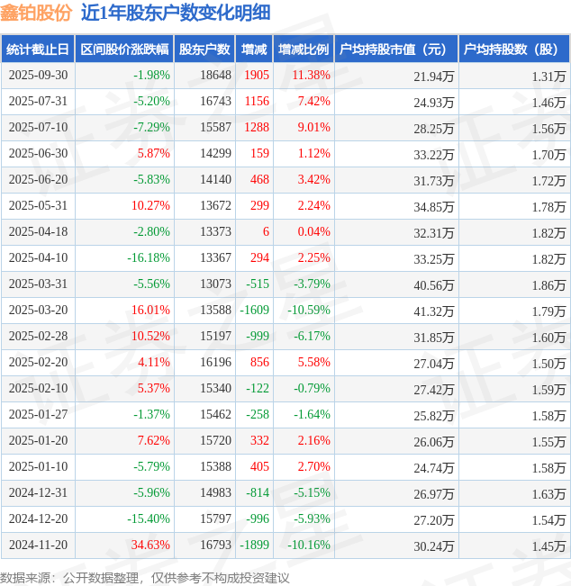 从股价来看,2025年7月31日至2025年9月30日,鑫铂股份区间跌幅为1.98%,在此期间股东户数增加1905.0户,增幅为11.38%。