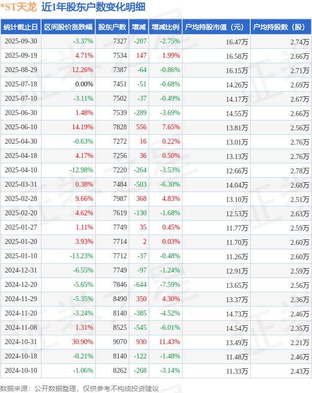 从股价来看,2025年9月19日至2025年9月30日,*ST天龙区间跌幅为3.37%,在此期间股东户数减少207.0户,减幅为2.75%。
