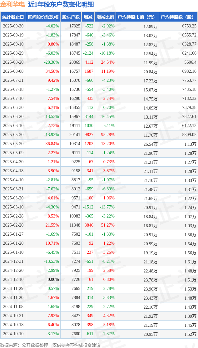 从股价来看,2025年9月19日至2025年9月30日,金利华电区间跌幅为4.02%,在此期间股东户数减少522.0户,减幅为2.92%。