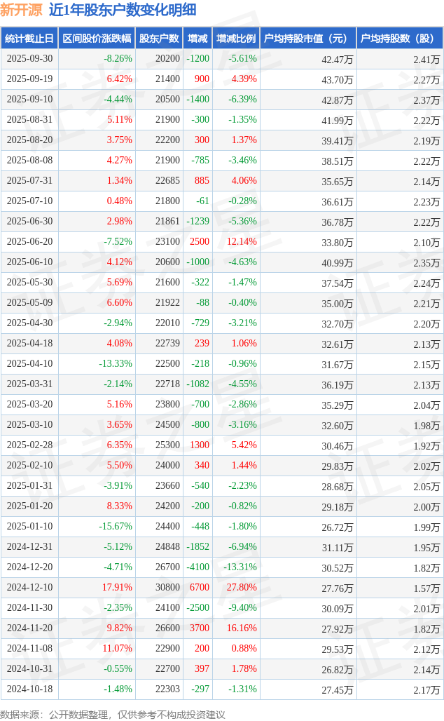 从股价来看,2025年9月10日至2025年9月30日,新开源区间跌幅为2.38%,在此期间股东户数减少300.0户,减幅为1.46%。
