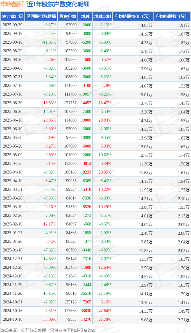 从股价来看,2025年9月19日至2025年9月30日,华峰超纤区间跌幅为3.17%,在此期间股东户数减少2000.0户,减幅为2.13%。